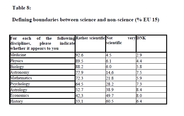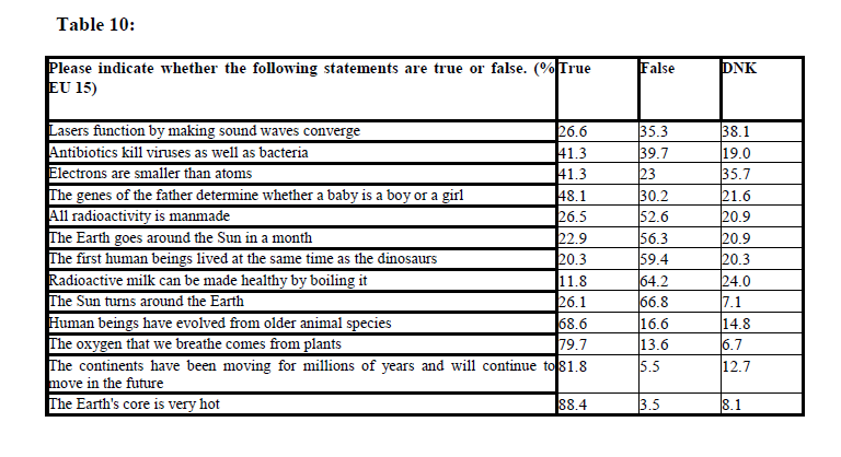 Die Umfrage aus dem Jahr 2001 war seinerzeit zu einer gewissen Berühmtheit gelangt, weil neben der Einstellung der Europäer zu verschiedenen echten oder vermeintlichen Wissenschaftsbereichen auch verschiedene Aussagen mit Wahr/Falsch/Weiß Nicht bewertet werden sollten – und die Ergebnisse durchaus überraschend waren:
