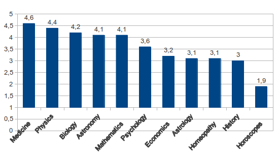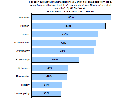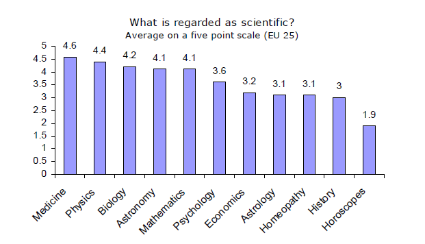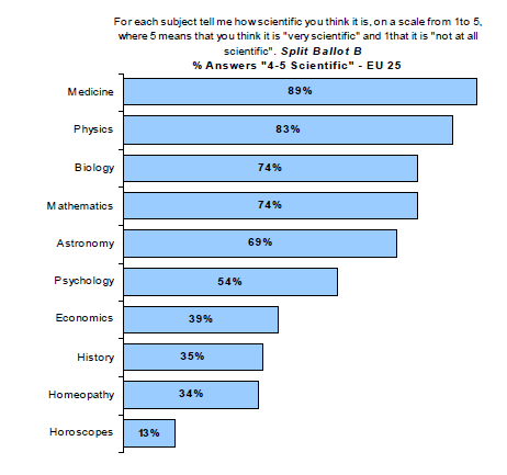 In 2005 wurden die Fragen zur Wissenschaftlichkeit dann ein wenig geändert. Dieses Mal mussten die Europäer die verschiedenen Fachgebiete auf einer Skala von 1 (absolut unwissenschaftlich) bis 5 („harte“ Wissenschaft) bewerten – und auch die Homöopathie tauchte in der Liste auf. Als weiteres Schmankerl ließ man die eine Hälfte ihre Einschätzung zur Astrologie angeben, die andere zu Horoskopen. Letztere Unterscheidung zeigte ein wahrlich beeindruckendes Ergebnis: Während 41% der Befragten die Astrologie auf obiger Skala mit 4 oder 5 bewerteten …