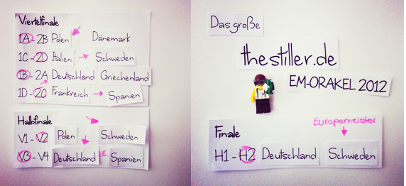 Für Schleckermäuler gibt es hier eine Anleitung – nebst Ergebnis einer „Simulation“ – für ein m&m’s-Orakel. Immerhin schafft es auch da die deutsche Mannschaft ins Finale: