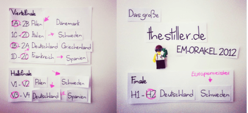 Bei den Datamining-Simulationen sieht die Bilanz nach immerhin 2 exakten Ergebnisprognosen (Spanien-Irland und Deutschland – Holland) und 3 weiteren, richtigen Tendenztipps schon wesentlich besser aus als letzte Woche. Ob hier dauernde Anpassungen zu noch mehr Treffern führen würden? Vielleicht daten die Dataminer irgendwann mal auch ihre Daten nach jedem Spiel ab – es wäre zumindest nicht uninteressant.