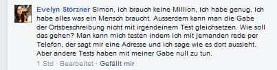 Nachdem nicht nur ich letzte Nacht auf den Unsinn hingewiesen hatte, mit dem eine selbst ernannte Hellseherin schamlose und zutiefst zynische Werbung für ihre vermeintlichen Fähigkeiten macht, hat sich in den letzten Stunden so einiges getan. Insbesondere die Dame selbst war fleißig und hat auf ihrem Facebookprofil alle Kommentare die ihr nicht gefallen haben gelöscht. Meistens waren es Fragen, zum Beispiel die – auch von mir gestellte – nach den Belegen für die von ihr behauptete 98%-ige Trefferquote (Zitat: Wenn die Polizei meine Dokumentationen möchte, aus welchen hervorgeht, dass meine Ortsbeschreibungen und Entfernungsangaben zu vermissten Personen zu 98% übereinstimmten, als man sie fand, so können sie diese gerne haben.). Aber der Fleiß dieser Dame war damit noch nicht am Ende, denn nachdem Lydia Benecke auf ihrer eigenen facebookseite nochmal ausführlich Stellung bezogen hatte (sehr, sehr lesenswert! Danke Lydia) meldete sich die Hellseherin auch dort und es begann das große Mimimi, in das ein paar ihrer Fans in geradezu lächerlicher Weise mit einstimmten. Die Frau behauptet tatsächlich sie werde gemobbt und postete mehrfach den immer gleichen, folgenden Kommentar: