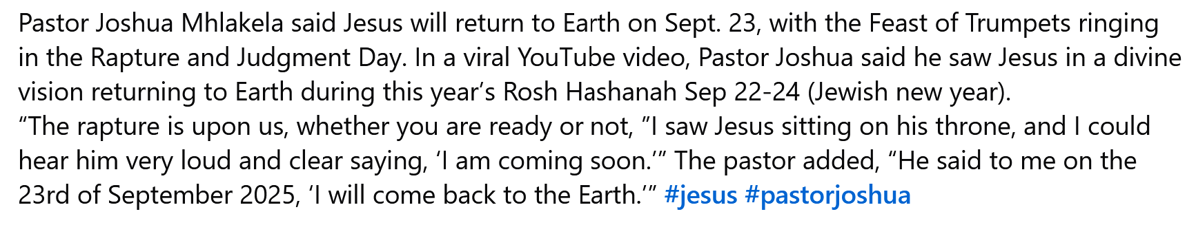 Joshua Mhlakela ist irgendein südafrikanischer „Pastor“ und er ist der nächste in der langen Liste derjenigen Idioten, die ein Datum für den Weltuntergang vorhergesagt haben. Und es ist, man glaubt es kaum, heute! Gemäß einem Facebookpost und diverser Meldungen auf X (bin ich nicht mehr) und Tiktok (war ich noch nie) ist er sich natürlich ganz, ganz sicher: