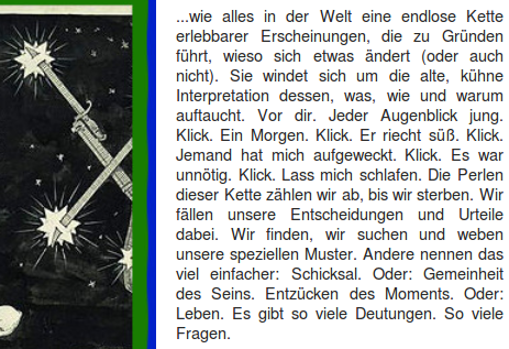 Viel, viel später erst wurde ein Reim für alle daraus, jene alte, mutige Wissenschaft, die Mutter aller Abstrakta, die noch heute als Spiegel tausendfacher Lebensmuster wirkt. Astrologie.