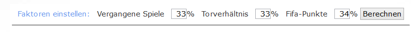 Wer ein wenig mit solchen Gewichtungen ein wenig spielen will, der kann dies auf der Seite „Fußballmathe“ tun. Für die eigene Prognose können die Gewichtungen für die Kategorien „Vergangene Spiele“, „Torverhältnis“ und „FIFA-Punkte“ variiert werden: